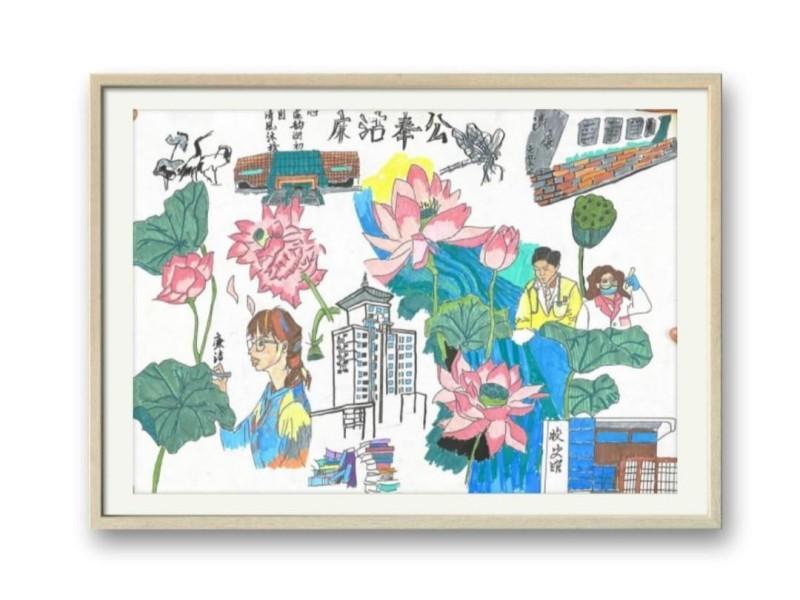创意说明:作品将校园建筑与中草药植物相融合,如砺志楼、厚德楼与荷花、杜仲等,传达勤勉坚韧、清雅廉洁的中医药文化精神,使廉洁教育融入师生日常。