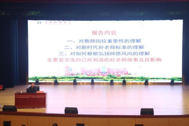 为进一步强化教师职业道德建设,引导全体教师坚守教育初心、担当育人使命,10月19日下午,我校特邀云南财经大学首席教授、博士研究生导师熊德平老师为全校教职工作以“弘扬师德风尚,做新时代党和人民满意的好老师”为主题的师德师风专题培训,全校教职工齐聚一堂,认真听讲,校长张颖主持培训会并提出要求。