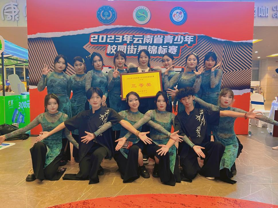 12月9日、10日,由云南省教育厅主办的2023年云南省青少年校园街舞锦标赛在昆明拉开序幕,我校由董慧明、李晓翠担任教练,李思淇、张福田、罗宇杰、普艳娇、赵刘爱、朱语曦、吕富龙、张熙彤、田艺、杨舒然、刀晓萍、石金禾、马子意13名学生代表学校参加本次校园街舞锦标赛。
