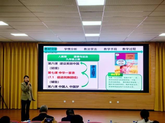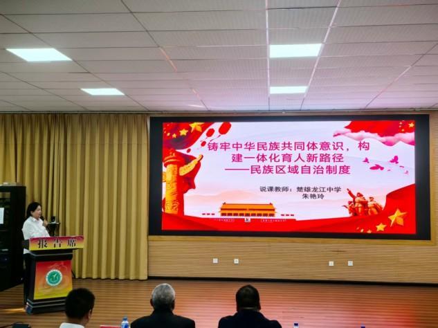 楚雄市东瓜街道滨江小学苏玉玲老师、楚雄市金鹿中学杨朝梅老师、楚雄市龙江中学朱艳玲老师深耕思政教材、充分挖掘楚雄元素,分别围绕“铸牢中华民族共同体意识”主题同课异构进行说课展示。三段说课体现了小学、初中、高中不同学段教学梯度,为各学段共同开展铸牢中华民族共同体意识教育提供了可借鉴的实践路径。