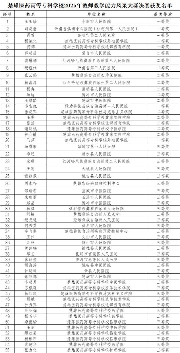 经激烈角逐,云南省滇南中心医院司晓倩、昆明市第二人民医院肖雪和个旧市人民医院王玉珍荣获讲课比赛一等奖;学校基础医学院杨艳文、通识教育学院何娜荣获说课比赛一等奖。