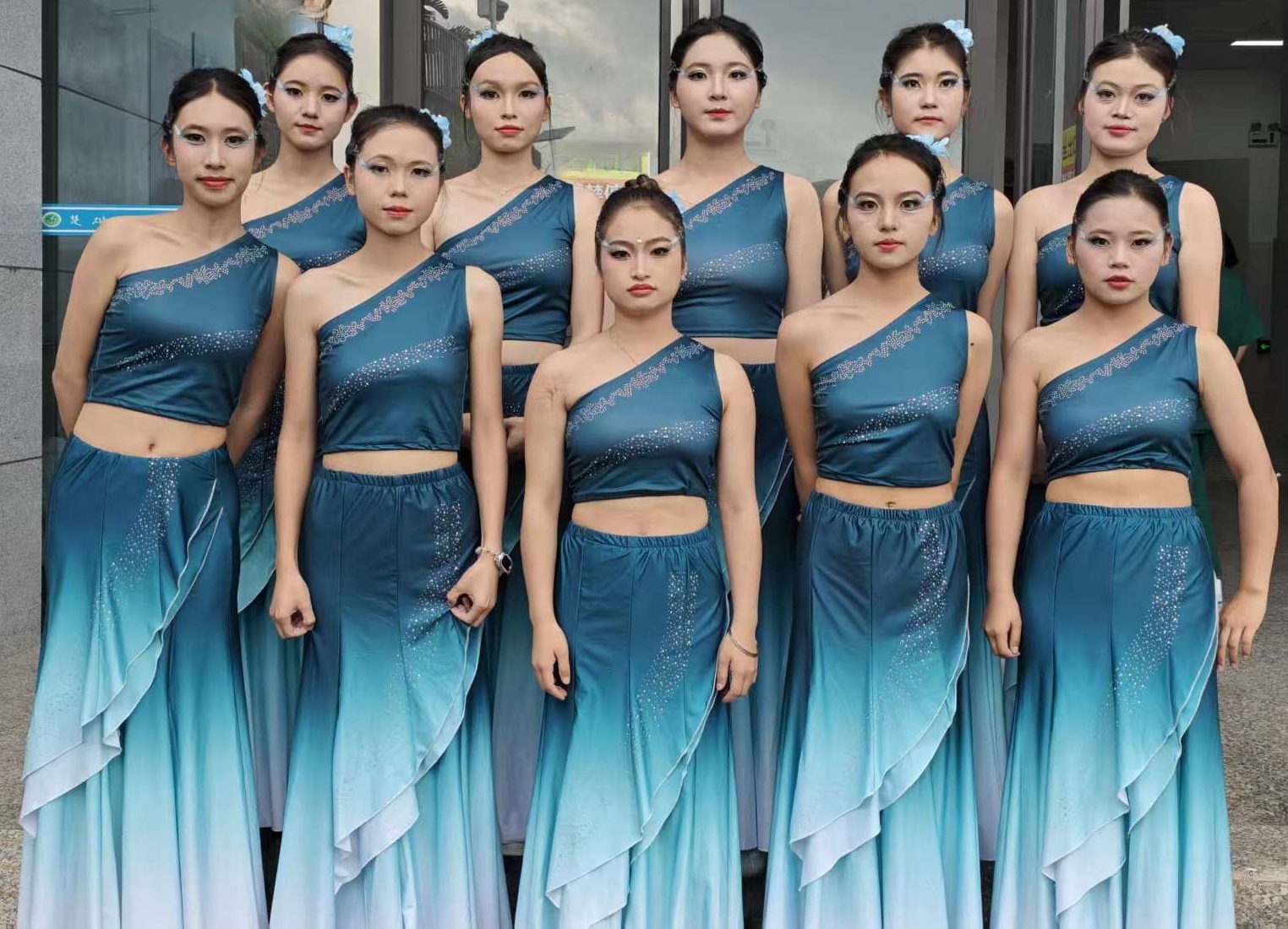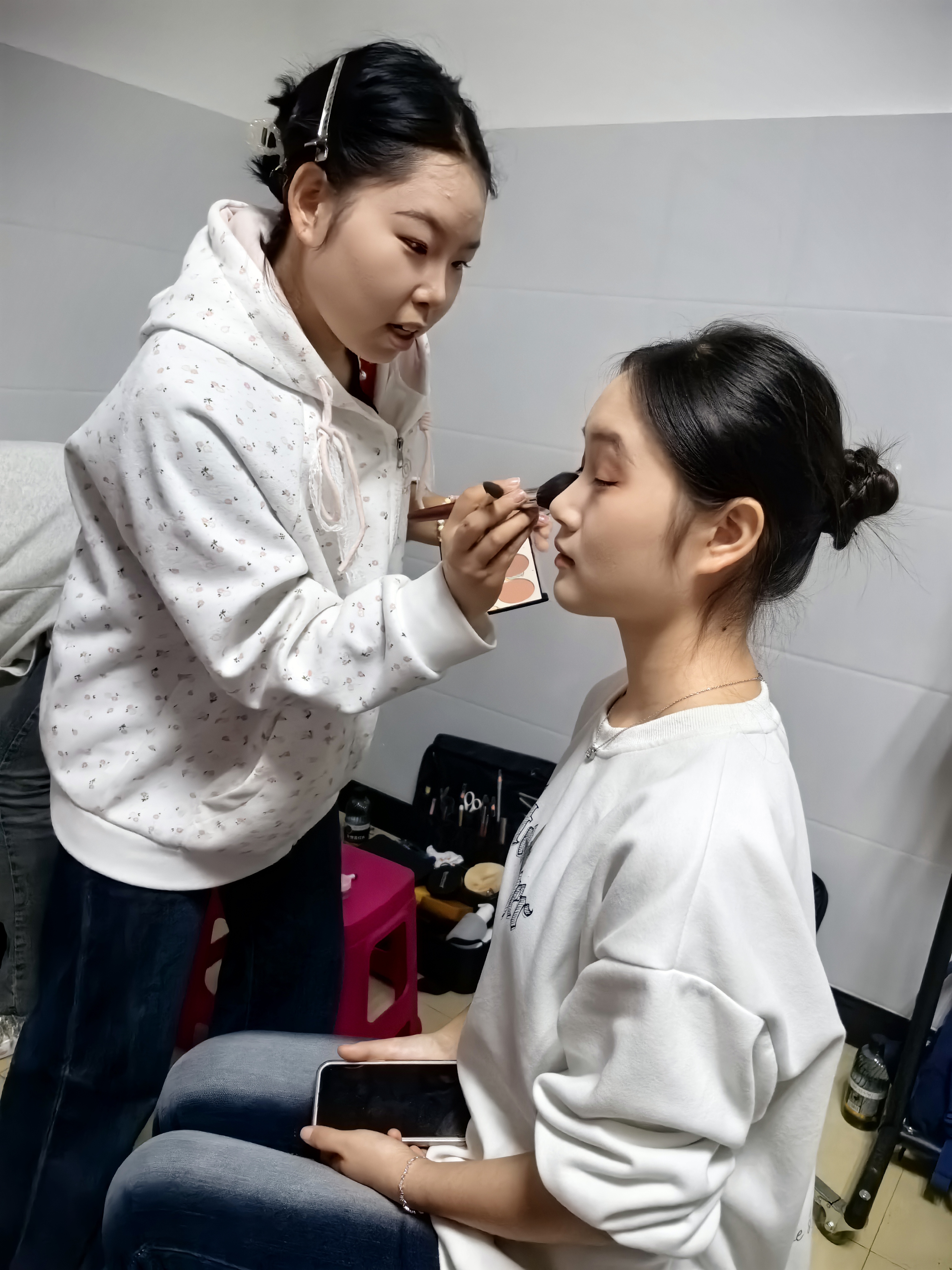 活动现场,团队以专业与热情投入服务。根据节目主题风格,为表演者量身打造个性化造型:民族舞妆容与服饰相映成趣,现代舞造型时尚灵动,色调细节精益求精。团队成员侯莹表示:“通过实践把课本知识转化为动手能力,不仅提升了自身专业技能,更深化了对医美专业的理解。”