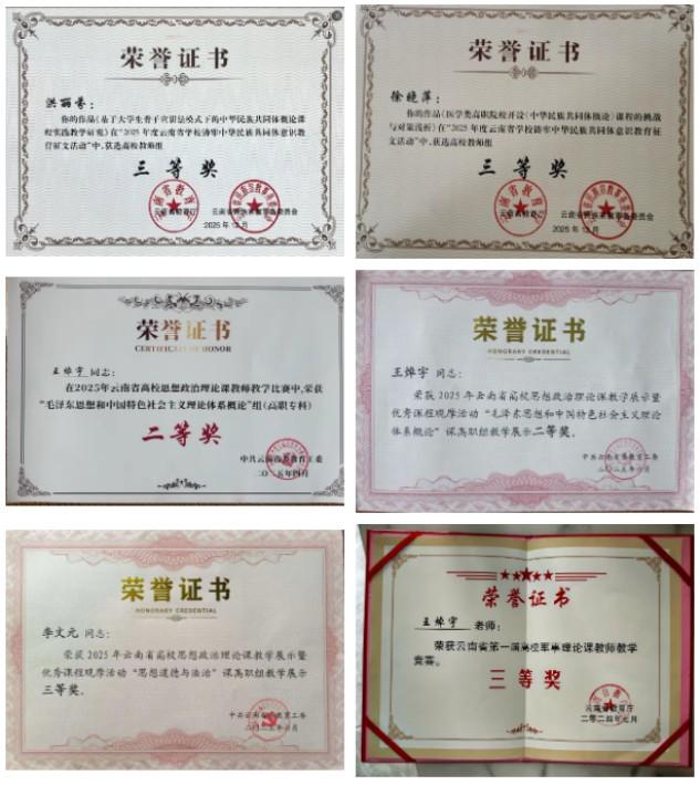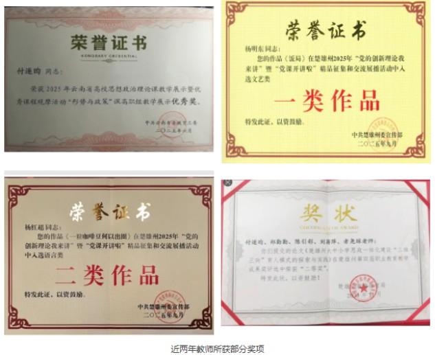 学院坚持以赛促学、以学促教,系统开展常态化、专题化、协同化集体备课,推进大中小学思政课一体化建设,淬炼教师教学本领。2025年,教师参加云南省高校思想政治理论课教学展示活动、教学比赛荣获二等奖3项、三等奖2项、优秀奖3项;参加楚雄州教学大比武荣获二等奖1项、三等奖1项;参加学校2025教师课堂教学大比武荣获一等奖1项、二等奖2项。参加全省铸牢中华民族共同体意识教育征文活动,2名教师荣获三等奖,为铸牢中华民族共同体意识贡献楚医力量。刘略老师申报的《数字赋能云南省特色思政教学资源库共享建设研究》课题获省部级课题立项;完成省教育厅课题结项3项,新申报立项2项,结题率达100%;校级课题立项3项、结项1项,公开发表科研论文3篇。2024-2025学年教师教学质量综合评价结果显示,学院中级职称3人次、初级职称11人次,进入同职称系列综合评价排名前30%,呈现出中坚力量扎实引领、青年教师快速成长的蓬勃态势。